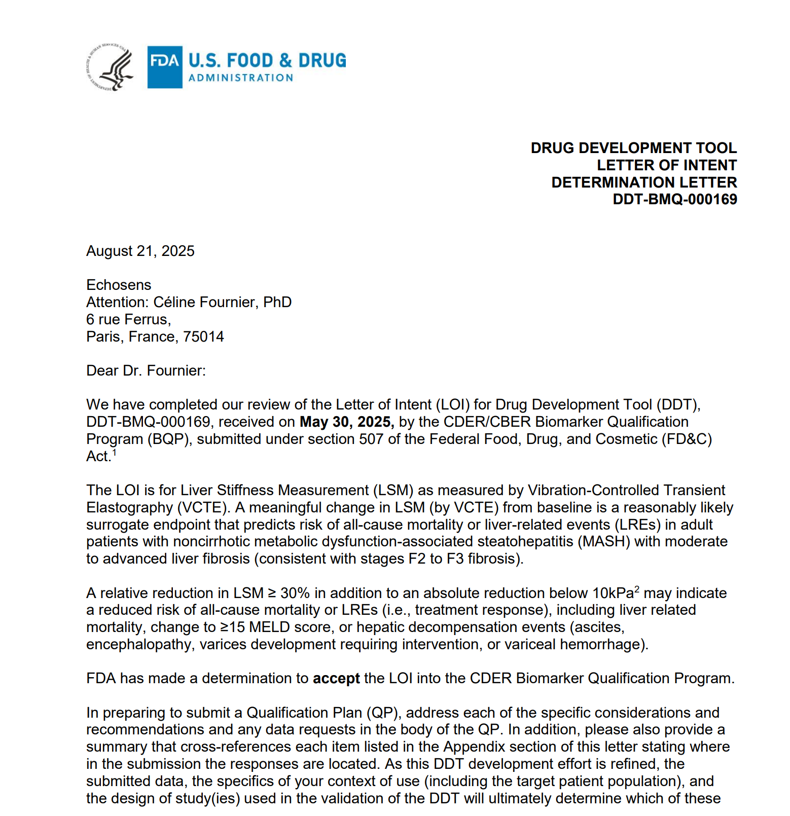2025年8月,美国食品药品监督管理局(FDA)正式致函福瑞股份子公司Echosens,确认接受其基于振动控制瞬时弹性成像(VCTE)技术测量的肝脏硬度值(LSM)作为代谢相关脂肪性肝炎(MASH)临床试验替代终点的意向书(LOI)。